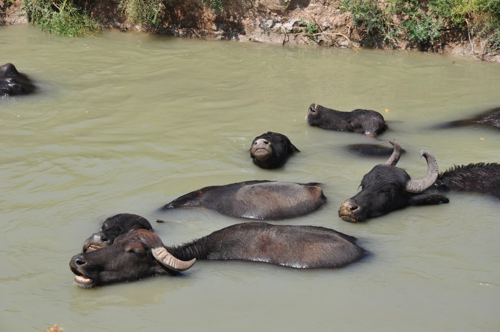 Des buffles se rafraîchissant de la chaude journée ainsi qu’un petit aperçu des meilleures bouilles