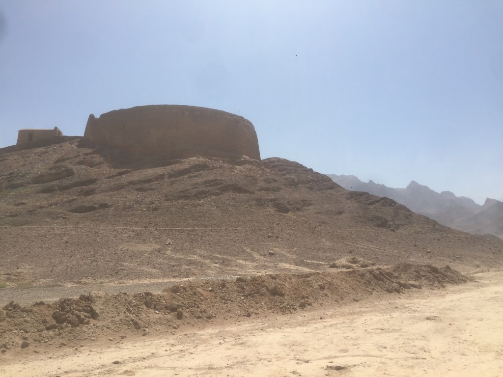 Une ancienne tour du silence aux alentours de la ville. Considérant les éléments (surtout le feu) comme trop purs pour être souillés par la mort, les zoroastriens déposent les dépouilles de leurs défunts en haut d’une tour du silence. Les oiseaux s’occupent ensuite de faire disparaître les corps